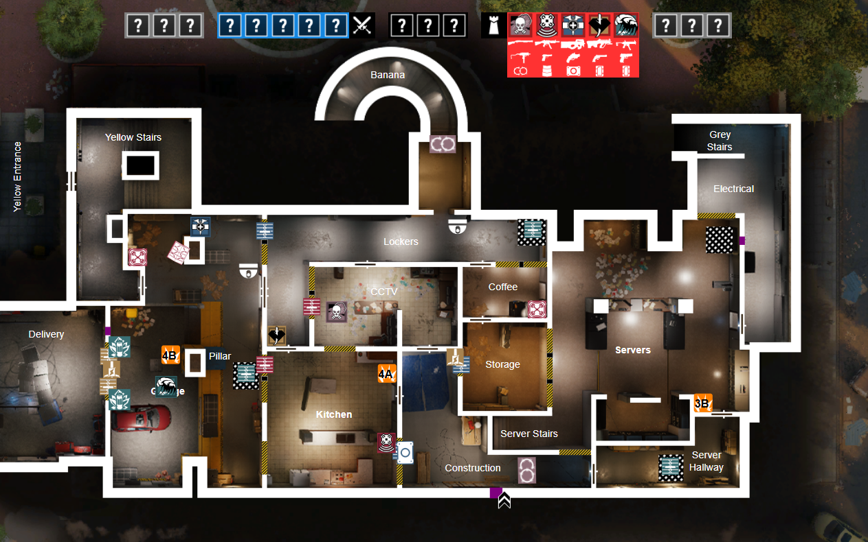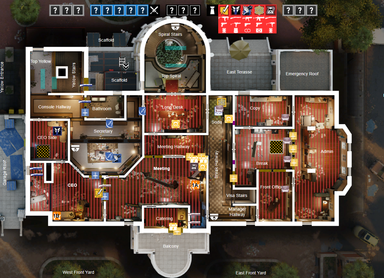 The CEO Push is a bit more surgical. A coordinated team will send a Buck into Piano early to clear players sitting in CEO. Meanwhile, the rest of the team focuses on wiping out utility on Yellow Stairs. Once both CEO and Yellow are under control, the attackers place someone on Bathroom window, smoke off (or ego-challenge) Secretary, and slide into Couches. From there, the planter rappels into CEO window and gets the plant down with relative safety.